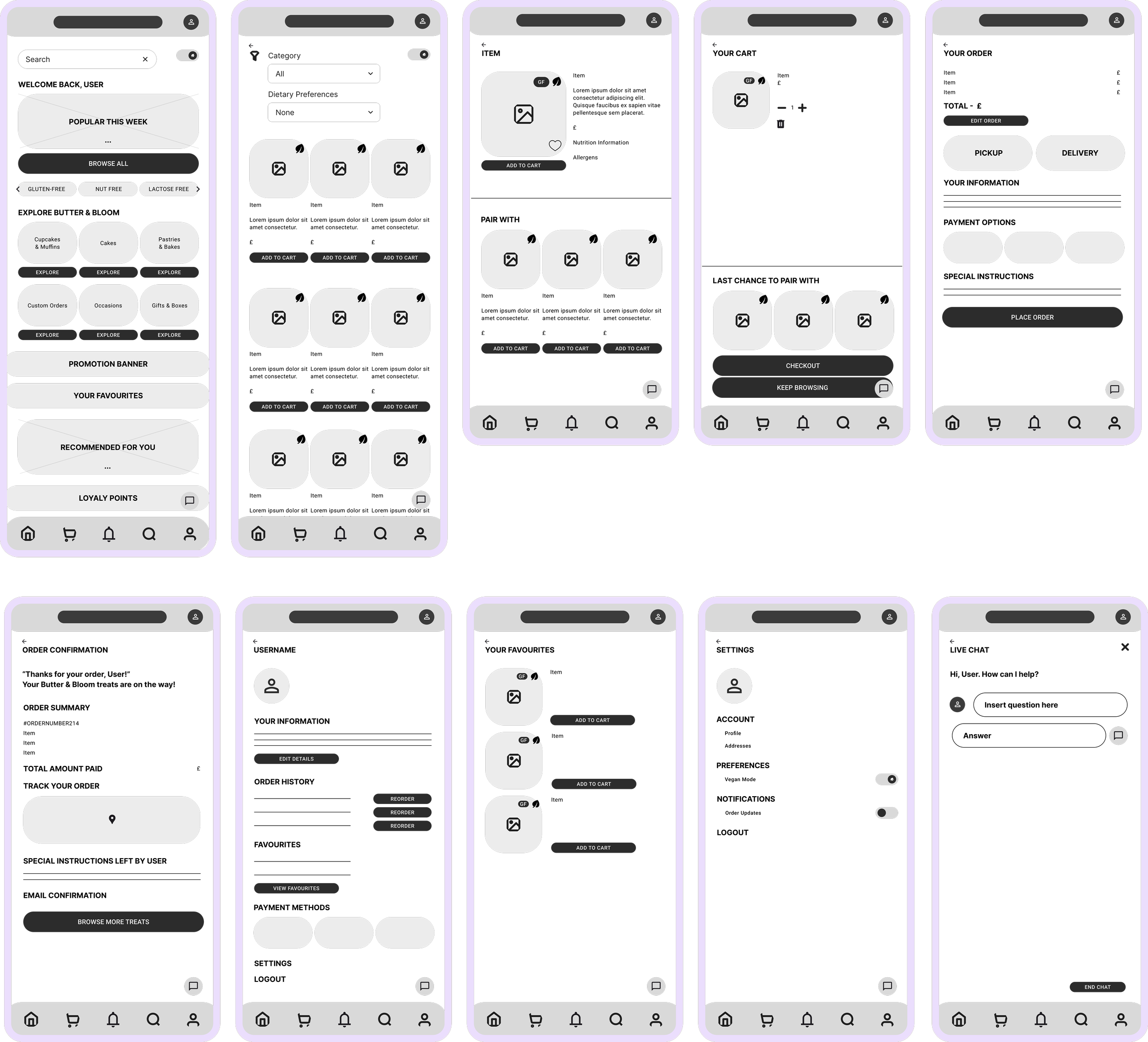 The surveys revealed that customers value clarity, simplicity, and flexibility above all when ordering from a bakery app. Clear labelling and dietary filters for vegan, gluten-free, and nut-free options are seen as essential, while cluttered menus and lengthy checkout processes often lead to frustration or even abandoned orders. Participants also highlighted the importance of personalisation, such as the ability to favourite items, place custom pre-orders, and quickly reorder past purchases. Delivery speed and pickup flexibility were considered critical, with users expecting accurate timings and real-time tracking to fit into their daily routines. Finally, accessibility emerged as a key consideration, with larger text, readable icons, and smooth navigation making the app more inclusive and boosting confidence for older users.