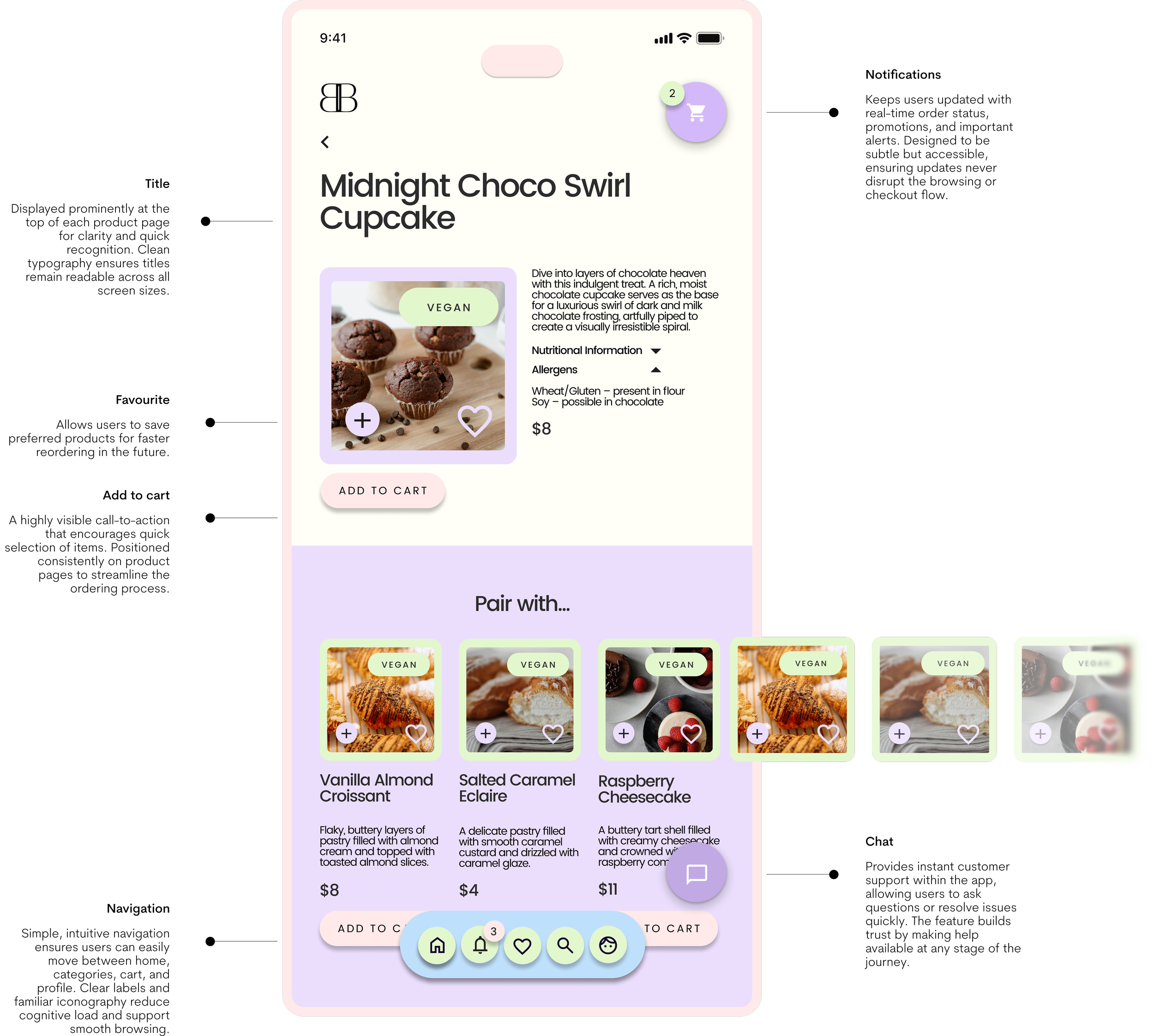 In designing the bakery app, accessibility was a core focus to ensure that the platform could be used comfortably by a wide range of customers, including those with visual, motor, or cognitive challenges. While the app already performed well in usability testing, several refinements were identified to make the experience more inclusive, intuitive, and aligned with accessibility best practices.