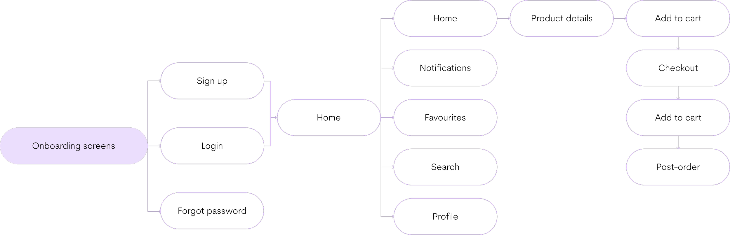 After defining the user personas and mapping their journeys, I created a universal user flow to capture the ideal path through the app.