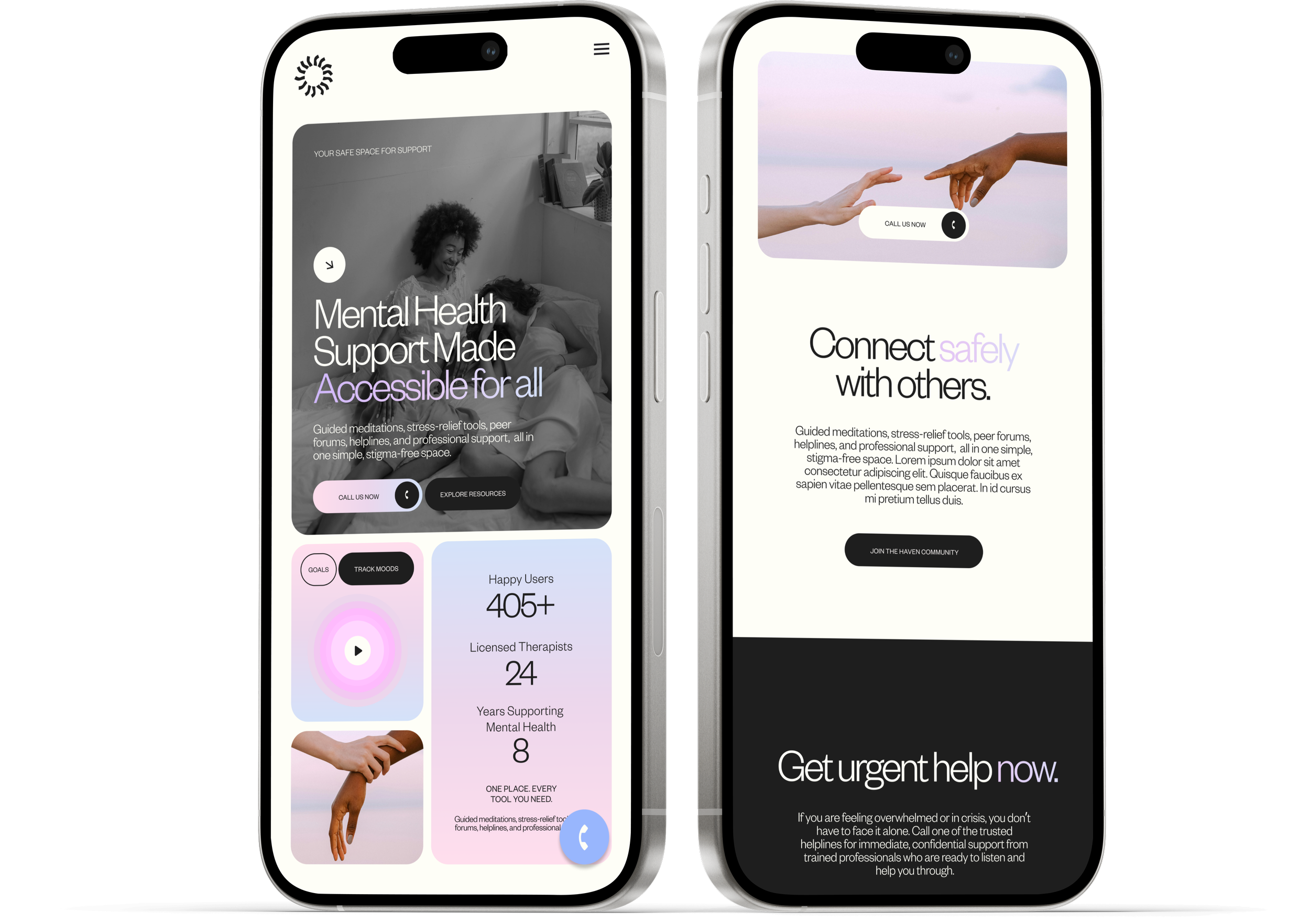 Accessibility was a central focus throughout the design of Haven. Clear typography, strong colour contrast, and simple navigation were prioritised to ensure that all users, including those with visual or cognitive impairments, can engage with the platform. Buttons and key actions such as “Call Now” were designed with sufficient size and spacing for ease of use, particularly on mobile devices. The platform also avoids clinical or stigmatising language, supporting users who may already be feeling vulnerable.