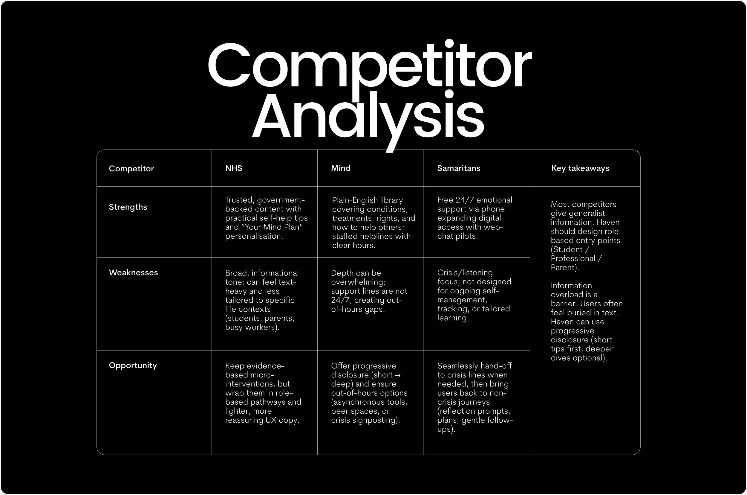 NHS Every Mind Matters offers evidence-based, government-backed guidance but can feel overly text-heavy and generalist. Mind provides an extensive library of plain-English information and helplines, though its depth can overwhelm users and its support is restricted to office hours. Samaritans delivers invaluable 24/7 crisis listening, but it is designed for immediate support rather than ongoing wellbeing. Together, these findings reveal a gap for Haven to occupy: providing accessible, personalised and always-available resources that bridge the space between crisis response and everyday mental health maintenance.