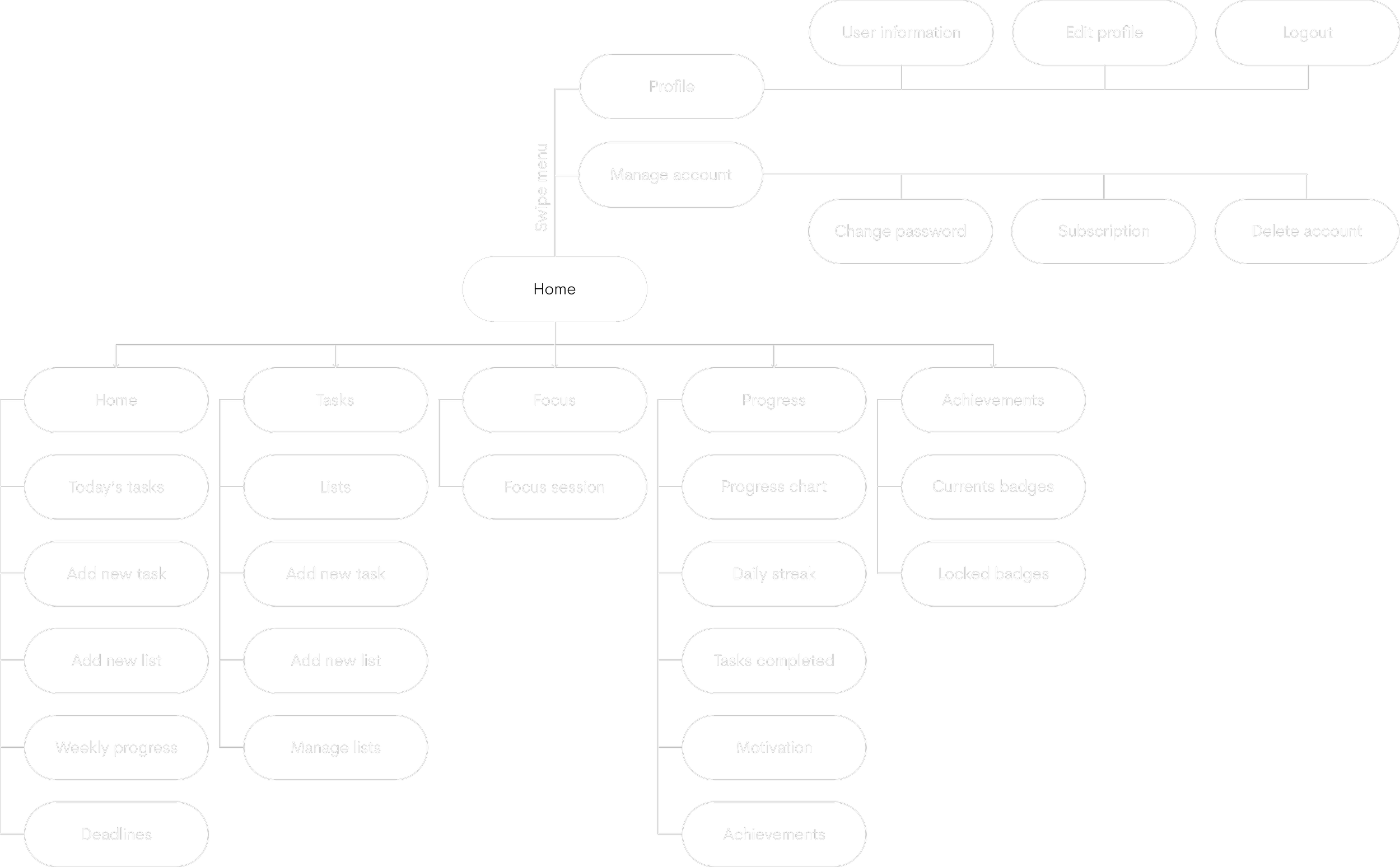 Primary features such as Home, Tasks, and Progress are placed within the bottom navigation for quick and consistent access, while secondary options like Profile and Settings are housed in the burger menu to avoid cluttering the main experience. This structure allows users to complete core actions, such as adding tasks, tracking progress, or viewing achievements, in just a few steps, while still providing access to customisation and account management. By keeping navigation simple and intuitive, the information architecture supports Kiai’s goal of creating a motivating, stress-free approach to productivity.